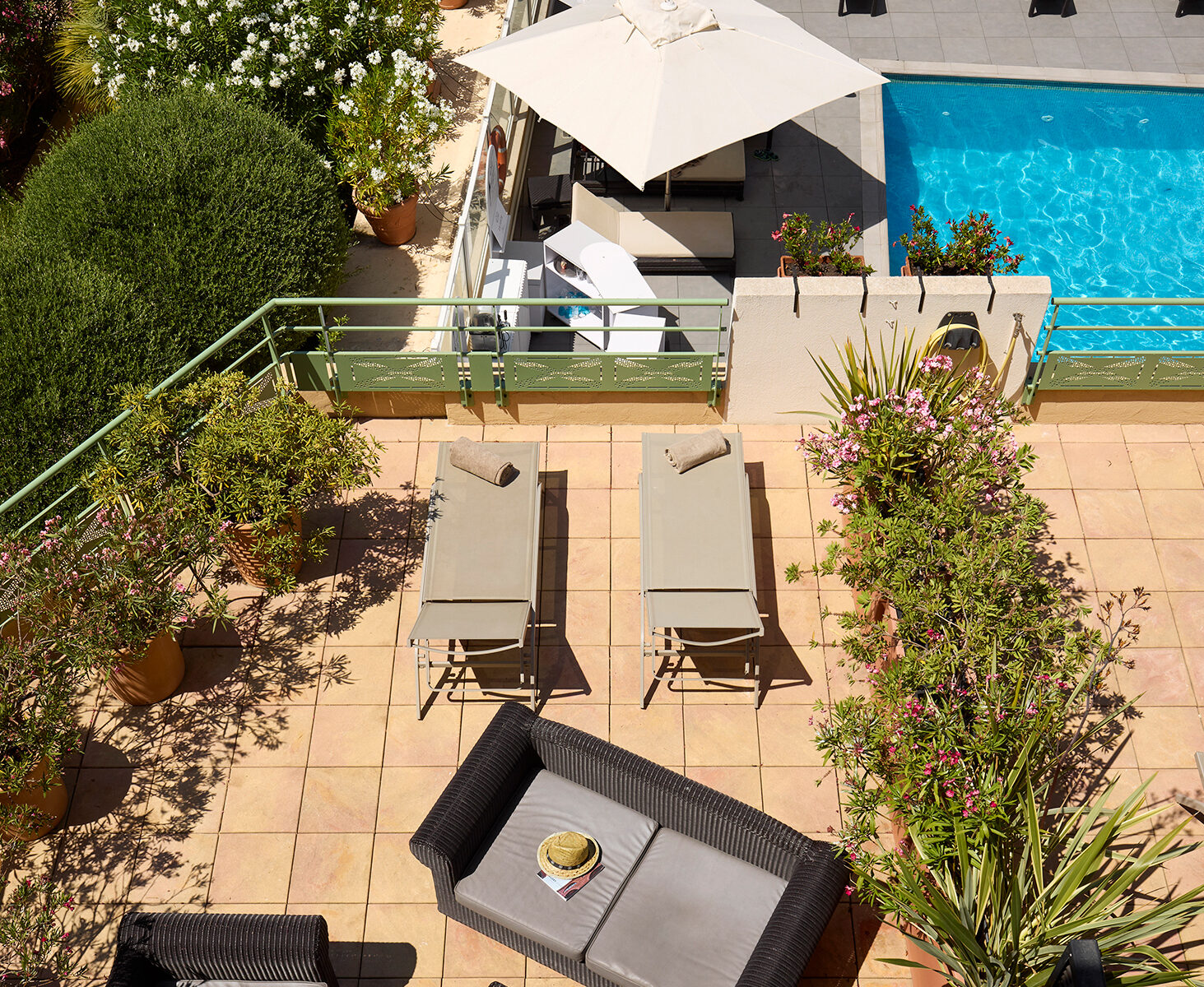 Nos chambres Deluxe avec grande terrasse, surplombent le patio et la piscine de l’hôtel, et vous offrent le rare privilège d’une spacieuse terrasse (superficie d’environ 30 à 40m²), ainsi qu’un mobilier de jardin et deux transats privatifs qui vous permettront de profiter pleinement de l’agréable climat provençal, dans un environnement calme et reposant, à deux pas de l’agitation du centre-ville. Tous les équipements nécessaires à un séjour inoubliable et reposant sont réunis dans la chambre : literie haut-de-gamme (lit double queen size ou 2 lits simples sur réservation auprès de l’hôtel), une cafétière Expresso , une bouilloire, un minibar, un téléviseur écran plat, un coffre-fort. La salle de bain, quant-à-elle, vous offre douche ou baignoire (sur réservation auprès de l’hôtel), et tout le confort nécessaire : Peignoirs et chaussons, sèche-cheveux, miroir grossissant et produits d’accueil et d’hygiène de qualité de la marque L’Occitane-en-Provence.